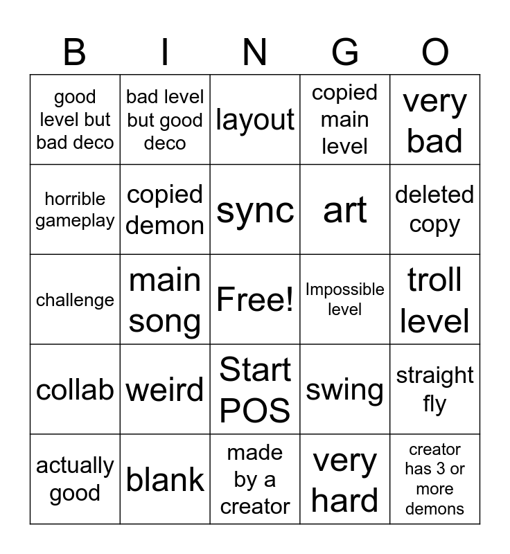 This bingo card has a free space and 24 words: weird, blank, sync, actually good, very bad, good level but bad deco, horrible gameplay, bad level but good deco, Impossible level, Start POS, art, challenge, swing, straight fly, copied demon, very hard, troll level, layout, deleted copy, main song, creator has 3 or more demons, collab, copied main level and made by a creator.
