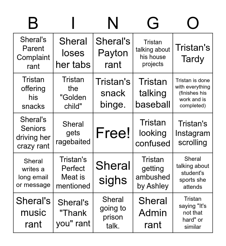 This bingo card has a free space and 24 words: Tristan's Perfect Meat is mentioned, Sheral's "Thank you" rant, Tristan's snack binge., Sheral's music rant, Tristan's Tardy, Sheral's Parent Complaint rant, Tristan offering his snacks, Sheral loses her tabs, Tristan looking confused, Sheral sighs, Tristan talking baseball, Sheral's Seniors driving her crazy rant, Tristan getting ambushed by Ashley, Sheral talking about student's sports she attends, Tristan the "Golden child", Sheral Admin rant, Tristan's Instagram scrolling, Sheral's Payton rant, Tristan is done with everything (finishes his work and is completed), Sheral gets ragebaited, Tristan saying "It's not that hard" or similar, Sheral writes a long email or message, Tristan talking about his house projects and Sheral going to prison talk..