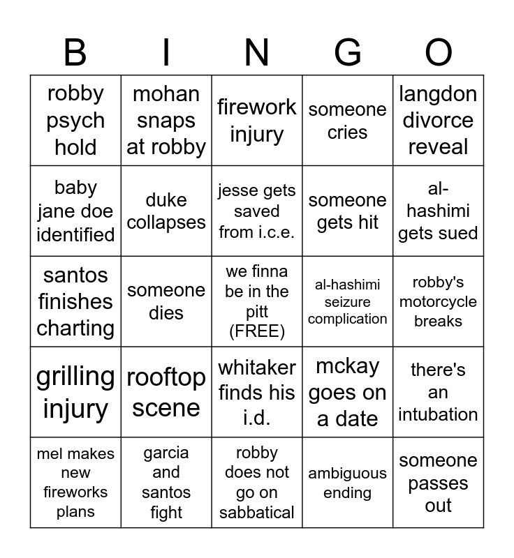 This bingo card has a free space and 28 words: there's an intubation, santos puts the blade back, someone gets hit, ambiguous ending, baby jane doe identified, firework injury, mohan snaps at robby, grilling injury, al-hashimi seizure complication, mel makes new fireworks plans, santos finishes charting, someone cries, garcia and santos fight, robby does not go on sabbatical, al-hashimi gets sued, langdon outs his addiction, rooftop scene, duke collapses, jesse gets saved from i.c.e., whitaker finds his i.d., robby psych hold, mohan goes into geriatrics, someone passes out, someone dies, robby's motorcycle breaks, mckay goes on a date, langdon divorce reveal and someone gets fired.