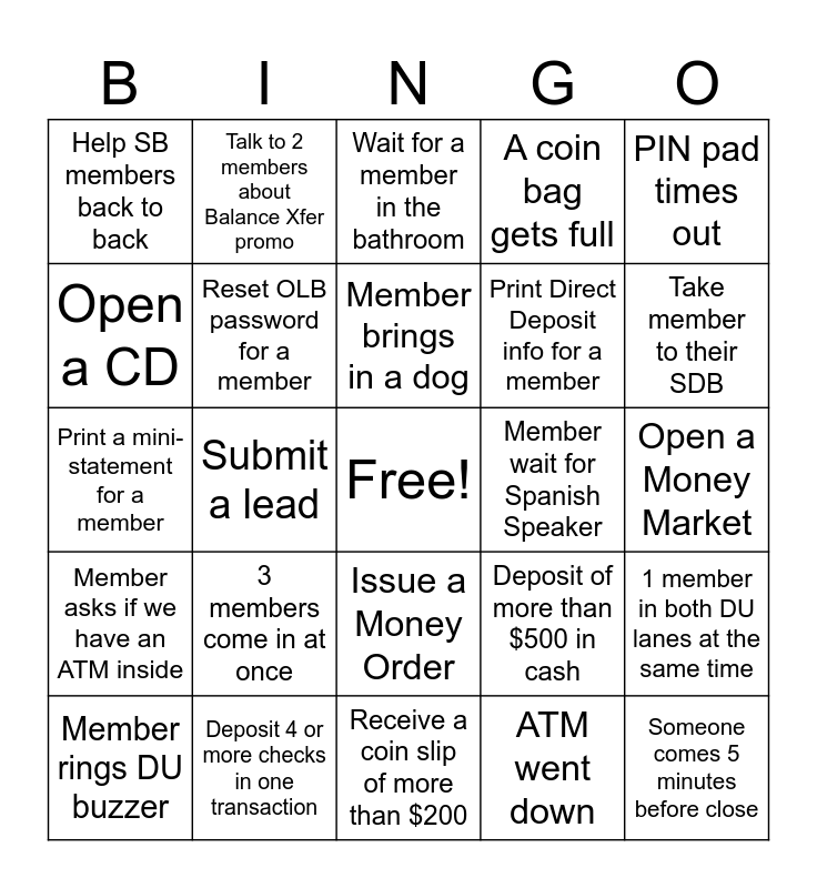 This bingo card has a free space and 24 words: Member rings DU buzzer, 3 members come in at once, Member brings in a dog, ATM went down, PIN pad times out, Help SB members back to back, Talk to 2 members about Balance Xfer promo, Wait for a member in the bathroom, Member wait for Spanish Speaker, Open a Money Market, Print a mini-statement for a member, Reset OLB password for a member, Deposit of more than $500 in cash, 1 member in both DU lanes at the same time, Open a CD, Deposit 4 or more checks in one transaction, Receive a coin slip of more than $200, A coin bag gets full, Take member to their SDB, Member asks if we have an ATM inside, Submit a lead, Issue a Money Order, Print Direct Deposit info for a member and Someone comes 5 minutes before close.