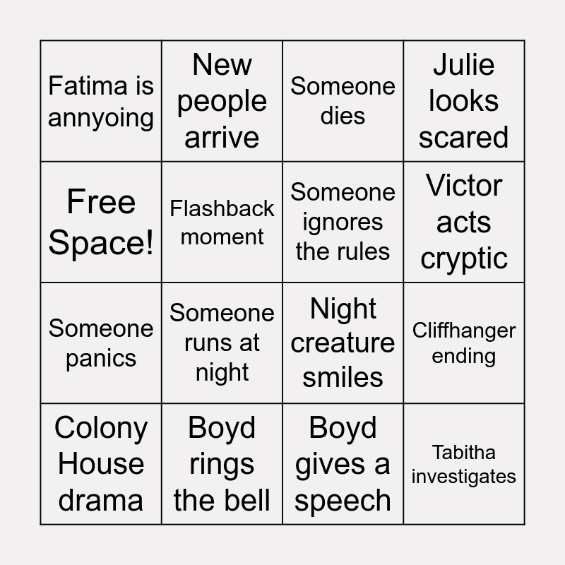 This bingo card has 16 words: Boyd rings the bell, Cliffhanger ending, Someone dies, Fatima is annyoing, Someone panics, New people arrive, Night creature smiles, Boyd gives a speech, Free Space!, Flashback moment, Colony House drama, Julie looks scared, Someone runs at night, Victor acts cryptic, Someone ignores the rules and Tabitha investigates.