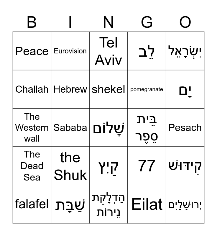 This bingo card has 33 words: יְרוּשָׁלַיִם, Magen David, Sababa, Hummus, The Dead Sea, Hebrew, יִשְׂרָאֵל, falafel, Eurovision, kibbutz, shekel, Tel Aviv, Hatikva, Cherry tomatoes, בֵּית סֵפֶר, יָם, שַׁבָּת, The Western wall, the Shuk, 77, קַיִץ, מִישְׁפָּחָה, Peace, Pesach, הַדְלָקַת נֵירוֹת, שָׁלוֹם, לֵב, pomegranate, Challah, קִידּוּשׁ, נְטִילַת יָדַיִים, Eilat and Kibbutz.