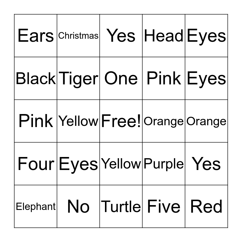 This bingo card has a free space and 52 words: Blue, Red, Dog, Turtle, Eyes, Nose, Christmas, Head, Black, Bird, Tiger, Tree, Yes, Purple, Green, Water, One, Orange, Four, Eyes, Yellow, Five, Ears, Pink, Blue, Red, Dog, Turtle, Eyes, Nose, Christmas, Head, Black, Tiger, Tree, Yes, No, Purple, Green, Water, One, Orange, Four, Eyes, Yellow, Five, Ears, Pink, Brown, White, Elephant and Monkey.