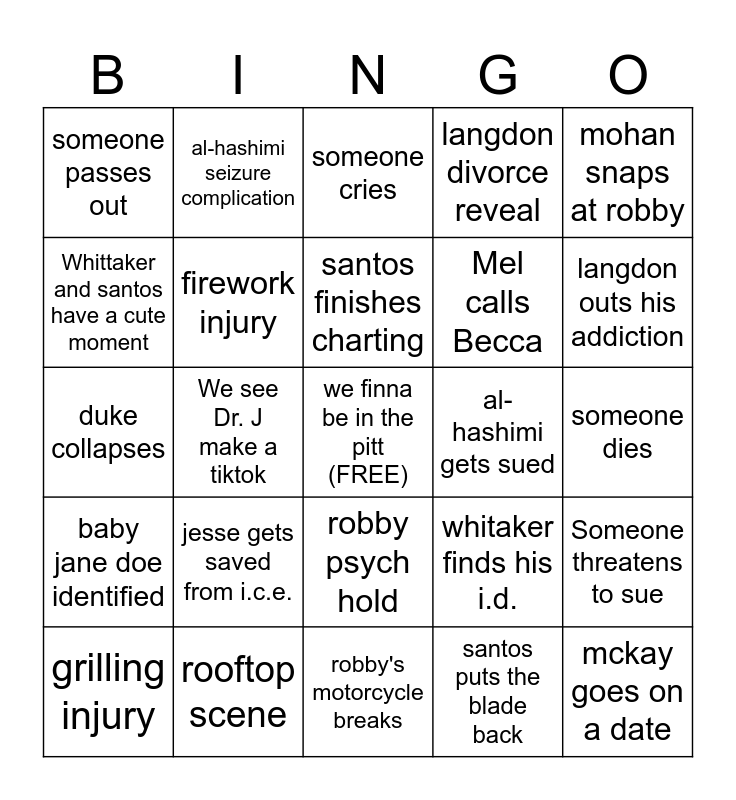 This bingo card has a free space and 34 words: there's an intubation, santos puts the blade back, someone gets hit, ambiguous ending, baby jane doe identified, firework injury, mohan snaps at robby, grilling injury, al-hashimi seizure complication, mel makes new fireworks plans, santos finishes charting, someone cries, garcia and santos fight, robby does not go on sabbatical, al-hashimi gets sued, langdon outs his addiction, rooftop scene, duke collapses, jesse gets saved from i.c.e., whitaker finds his i.d., robby psych hold, mohan goes into geriatrics, someone passes out, someone dies, robby's motorcycle breaks, mckay goes on a date, langdon divorce reveal, someone gets fired, Mel calls Becca, Whittaker and santos have a cute moment, Someone quits, We see Dr. J make a tiktok, Someone threatens to sue and Mohans mom is in danger.