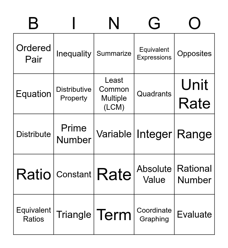 This bingo card has 49 words: Free!, Variable, Coefficient, Term, Constant, Exponent, Inequality, Expression, Equation, Order of Operations, Distributive Property, Equivalent Expressions, Rational Number, Absolute Value, Reciprocal, Greatest Common Factor (GCF), Least Common Multiple (LCM), Integer, Divide fractions, Opposites, Prime Number, Coordinate Graphing, Ordered Pair, Quadrants, Coordinate Plane, Unit Rate, Equivalent Ratios, Percent, Rate, Ratio, Net, Surface Area, Parallelogram, Trapezoid, Triangle, Mean, Median, Mode, Range, Interquartile Range (IQR), Histogram, Dot Plot, Evaluate, Simplify, Distribute, Summarize, Justify/Explain, Value and Digit.