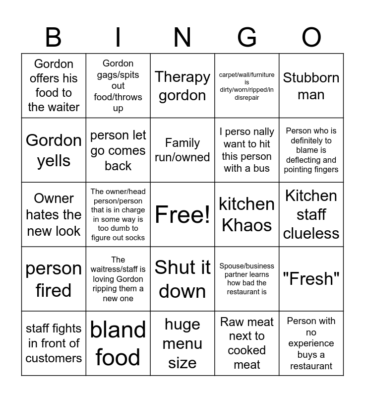 This bingo card has a free space and 42 words: Mold, Family run/owned, Gordon gives wild insult, The waitress/staff is loving Gordon ripping them a new one, Raw meat next to cooked meat, "Fresh", Person with no experience buys a restaurant, Marriage on the rocks, Therapy gordon, Shut it down, Kitchen staff clueless, Person who is definitely to blame is deflecting and pointing fingers, The owner/head person/person that is in charge in some way is too dumb to figure out socks, Stubborn man, Weirdly loyal staff / loyal spouse, Spouse/business partner learns how bad the restaurant is, 10/10 food, Owner hates the new look, Wtf even is the decor, Gordon gags/spits out food/throws up, Gordon yells, Owner shows off "talent" during hours, Gordon fingers The food, Gordon offers his food to the waiter, Waiter knows food sucks, Waiter/server thinks there's a chance he'll like it, I perso nally want to hit this person with a bus, someone cries, bugs, 500,000+ debt, the microwave special, person fired, person let go comes back, huge menu size, reheated / old food being served, staff fights in front of customers, bland food, kitchen Khaos, rotten food, dissociating dad (or other person), carpet/wall/furniture is dirty/worn/ripped/in disrepair and exhausted Gordon.