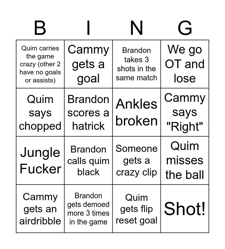 This bingo card has 23 words: Shot!, Brandon crashes out, Cammy says "Right", Brandon says "hmmm interesting", Quim says chopped, Quim carries the game crazy (other 2 have no goals or assists), Brandon scores a hatrick, Cammy gets a goal, Cammy gets an airdribble, All octanes in the match (enemy team), Brandon calls quim black, Jungle Fucker, We reference gifs from instagram, Rule 1, Brandon gets demoed more 3 times in the game, Cammy gets MVP, Brandon takes 3 shots in the same match, Someone gets a crazy clip, Ankles broken, Quim misses the ball, We go OT and lose, Quim gets flip reset goal and Someone scores a pintch.