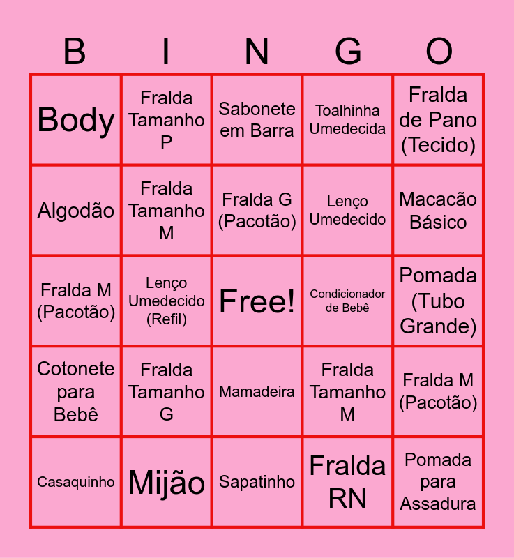 This bingo card has a free space and 38 words: Fralda RN, Fralda Tamanho P, Fralda P (Pacotão), Fralda Tamanho M, Fralda M (Pacotão), Fralda Tamanho G, Fralda G (Pacotão), Fralda Tamanho XG, Fralda de Pano (Tecido), Lenço Umedecido, Lenço Umedecido (Refil), Toalhinha Umedecida, Pomada para Assadura, Pomada (Tubo Grande), Algodão, Cotonete para Bebê, Sabonete Líquido, Sabonete em Barra, Shampoo de Bebê, Condicionador de Bebê, Body, Mijão, Macacão Básico, Casaquinho, Par de Meias, Sapatinho, Luvinhas, Touca, Pano de Boca (Fraldinha), Babador, Chupeta, Mamadeira, Fralda RN, Fralda Tamanho P, Fralda P (Pacotão), Fralda Tamanho M, Fralda M (Pacotão) and Fralda Tamanho G.