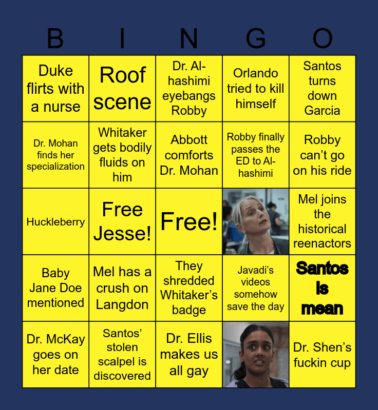 This bingo card has 2 images, a free space and 22 words: Mel has a crush on Langdon, Santos’ stolen scalpel is discovered, Abbott comforts Dr. Mohan, Dr. McKay goes on her date, Santos turns down Garcia, Duke flirts with a nurse, Dr. Mohan finds her specialization, Roof scene, They shredded Whitaker’s badge, Robby finally passes the ED to Al-hashimi, Huckleberry, Javadi’s videos somehow save the day, Santos is mean, Whitaker gets bodily fluids on him, Mel joins the historical reenactors, Dr. Al-hashimi eyebangs Robby, Robby can’t go on his ride, Free Jesse!, Dr. Shen’s fuckin cup, Baby Jane Doe mentioned, Orlando tried to kill himself and Dr. Ellis makes us all gay.