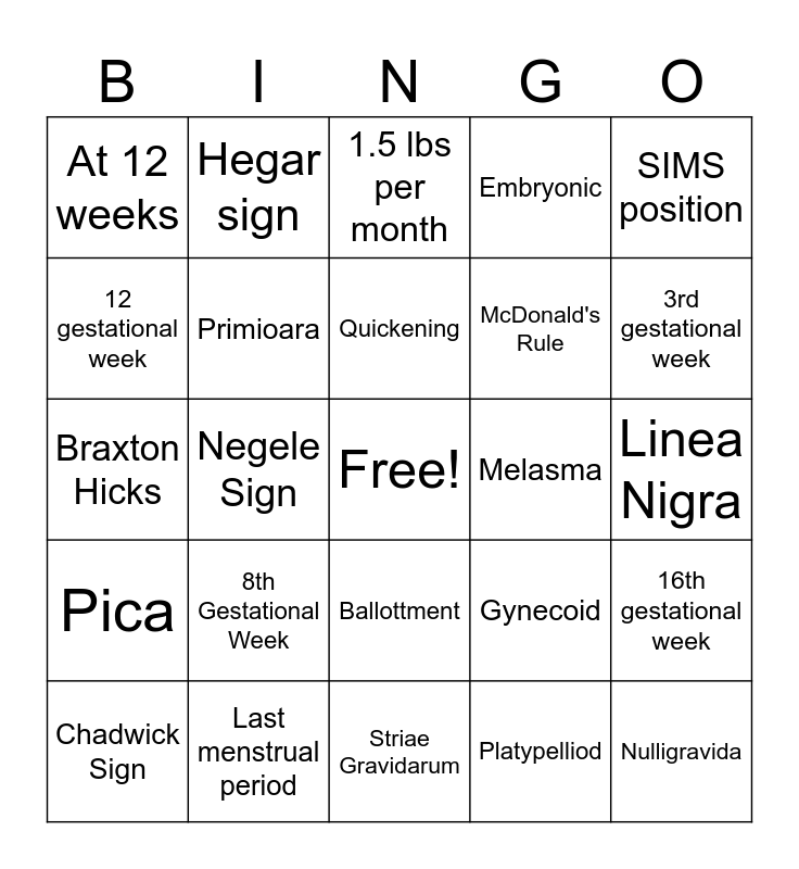 This bingo card has a free space and 24 words: Chadwick Sign, 8th Gestational Week, Quickening, Platypelliod, SIMS position, At 12 weeks, Hegar sign, 1.5 lbs per month, Melasma, Linea Nigra, Braxton Hicks, Primioara, Gynecoid, 16th gestational week, 12 gestational week, Last menstrual period, Striae Gravidarum, Embryonic, 3rd gestational week, Pica, Negele Sign, Ballottment, McDonald's Rule and Nulligravida.