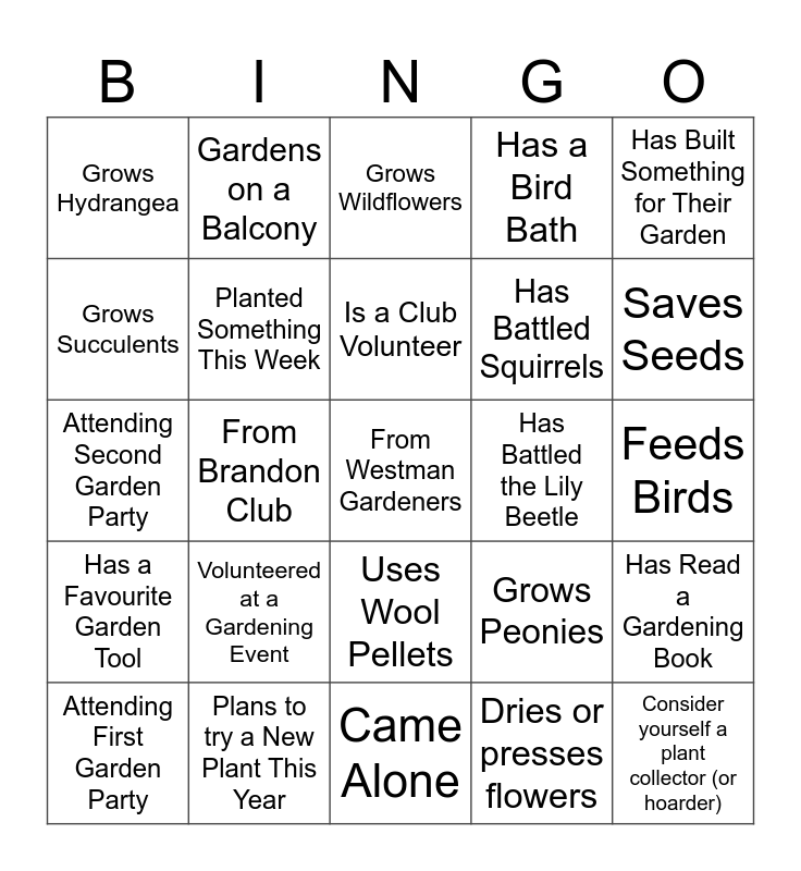 This bingo card has 160 words: Free!, Has a Woodland Garden, Has a Water Feature, Has a Pond, Has a Rain Garden, Has a Vertical Garden, Grows Tomatoes, Grows Hot Peppers, Grows Herbs, Grows Hostas, Grows Succulents, Grows Native Plants, Grows Wildflowers, Grows Dahlias, Grows Peonies, Grows Tulips, Grows Sunflowers, Grows Zinnias, Grows Marigolds, Grows Cosmos, Grows Vegetables from Seed, Grows Fruit (berries or trees), Grows Garlic, Grows Onions, Grows Pumpkins, Grows Roses, Grows Hydrangea, Grows Lisianthus, Grows Lilies, Grows Raspberries, Grows Strawberries, Grows Haskaps, Grows Canas, Gardening for 1–2 Years, Gardening for 5+ Years, Gardening for 10+ Years, Gardened with a Grandparent, Self-Taught Gardener, Takes Garden Photos Regularly, Keeps a Garden Journal, Saves Seeds, Swaps Seeds with Others, Starts Seeds Indoors, Buys Most Plants, Composts, Vermi-composts, Uses Rain Barrels, Water-wise Gardener, Organic Gardener, Uses Companion Planting, Has Tried Square Foot Gardening, Has Killed a Plant This Year, Talks to Their Plants, Dries or presses flowers, Loves to prune trees or shrubs, Consider yourself a plant collector (or hoarder), Owns a horihori knife (or knows what one is), Loves Bees, Attracts Hummingbird, Attracts Butterflies, Feeds Birds, Has a Bird Bath, Has a Bee Hotel, Has Seen a Ladybug Recently, Has Garden Visitors (deer, rabbits, etc.), Has Battled Squirrels, Has Battled Slugs, Has Battled Aphids, Has Battled Potato Beetles, Has Battled the Lily Beetle, Uses Natural Pest Control, Avoids Garden Chemicals, Owns Too Many Pots, Has a Favourite Garden Tool, Uses Mulch, Uses Manure by the Truck Load, Uses Wool Pellets, Uses Drip Irrigation, Uses Soaker Hoses, Prunes Regularly, Divides Perennials, Has Built Something for Their Garden, Uses Plant Labels, Forgets What They Planted, Follows a Planting Calendar, Uses Fertilizer Regularly, Makes Their Own Compost Tea, Loves Getting Their Hands Dirty, Prefers Weeding to Watering, Prefers Watering to Weeding, Early Morning Gardener, Evening Gardener, Listens to Music While Gardening, Gardens for Relaxation, Gardens for Food, Gardens for Beauty, Has a Favourite Plant, Has a “Problem Plant”, Has Rearranged a Garden Bed More Than Once, Impulse Buys Plants, Says “just one more plant”, Attending First Garden Party, Attending Second Garden Party, Volunteered at a Gardening Event, Has Taken a Gardening Workshop, Has Given Gardening Advice, Has Received Gardening Advice, Brings Plants to Share, Has Done a Plant Swap, Knows Someone at This Event, Met Someone New Today, Came with a Friend, Came Alone, Plans to Join a Club, Is a Club Volunteer, Planted Something This Week, Waiting to Plant (too early!), Already Bought Plants This Season, Planning This Year’s Garden, Looking Forward to Summer Blooms, Gardens in Windy Conditions, Uses Frost Protection, Gardens at a Community Garden, Gardens in Full Sun, Gardens in Partial Shade, Has More Plants Than Space, Has Named a Plant, Has Gifted a Plant, Has Received a Plant as a Gift, Has Rescued a Discount Plant, Loves Garden Centres, Can’t Leave a Garden Centre Empty-Handed, Has a Favourite Garden Centre, Plans to try a New Plant This Year, Has a Plant They Regret Buying, Has Googled a Plant Problem This Week, Has Watched a Gardening Video Recently, Has Read a Gardening Book, Has a Garden Wish List, Has a Plant App on Phone, From Beautiful Plains Club, From Brandon Club, From Charleswood Club, From St James Club, From West Kildonan Club, From Westman Gardeners, Not a member of a club (yet), Gardens on a Balcony, Has a Backyard Vegetable Garden, Has a Front Yard Garden, Uses Raised Beds, Gardens in Containers, Has a Greenhouse, Has a Cold Frame, Gardens at a Cottage, Has Indoor Plants, Has a Pollinator Garden, Has a Native Plant Garden, Has a Xeriscape Garden and Has a Rock Garden.