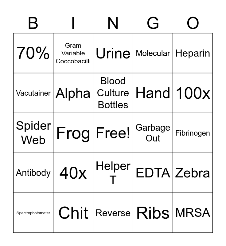 This bingo card has a free space and 24 words: 40x, Chit, Blood Culture Bottles, Spectrophotometer, Heparin, 70%, Vacutainer, Gram Variable Coccobacilli, Garbage Out, Helper T, Hand, Spider Web, EDTA, Zebra, Alpha, Ribs, Fibrinogen, Urine, 100x, Frog, MRSA, Antibody, Molecular and Reverse.