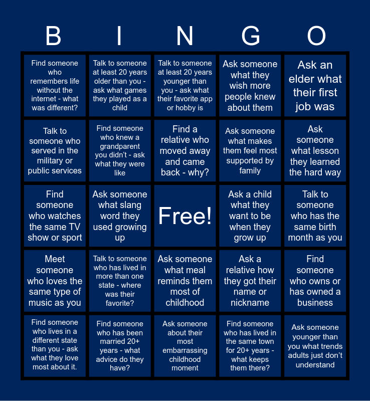 This bingo card has a free space and 24 words: Find someone who lives in a different state than you - ask what they love most about it., Talk to someone who has lived in more than one state - where was their favorite?, Find a relative who moved away and came back - why?, Find someone who has lived in the same town for 20+ years - what keeps them there?, Ask an elder what their first job was, Find someone who remembers life without the internet - what was different?, Talk to someone at least 20 years older than you - ask what games they played as a child, Talk to someone at least 20 years younger than you - ask what their favorite app or hobby is, Ask a child what they want to be when they grow up, Talk to someone who has the same birth month as you, Find someone who watches the same TV show or sport, Find someone who knew a grandparent you didn’t - ask what they were like, Ask a relative how they got their name or nickname, Find someone who owns or has owned a business, Talk to someone who served in the military or public services, Find someone who has been married 20+ years - what advice do they have?, Ask someone about their most embarrassing childhood moment, Ask someone what they wish more people knew about them, Ask someone what lesson they learned the hard way, Meet someone who loves the same type of music as you, Ask someone what slang word they used growing up, Ask someone what meal reminds them most of childhood, Ask someone what makes them feel most supported by family and Ask someone younger than you what trends adults just don’t understand.