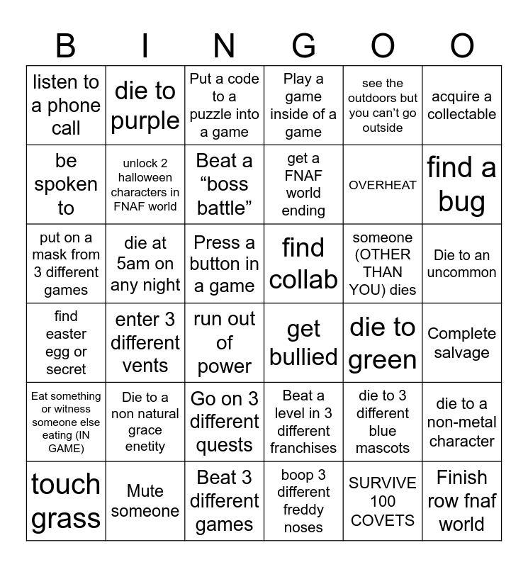 This bingo card has 36 words: Beat a level in 3 different franchises, Go on 3 different quests, boop 3 different freddy noses, be spoken to, find easter egg or secret, find collab, unlock 2 halloween characters in FNAF world, Beat 3 different games, see the outdoors but you can’t go outside, die to 3 different blue mascots, find a bug, Play a game inside of a game, die to a non-metal character, die at 5am on any night, get a FNAF world ending, listen to a phone call, Eat something or witness someone else eating (IN GAME), someone (OTHER THAN YOU) dies, put on a mask from 3 different games, Put a code to a puzzle into a game, Press a button in a game, enter 3 different vents, get bullied, run out of power, die to green, die to purple, OVERHEAT, Mute someone, Beat a “boss battle”, acquire a collectable, Finish row fnaf world, touch grass, Complete salvage, Die to an uncommon, Die to a non natural grace enetity and SURVIVE 100 COVETS.