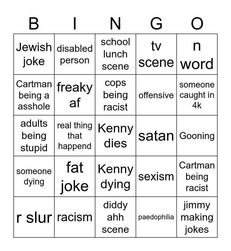 This bingo card has a free space and 24 words: fat joke, racism, cops being racist, r slur, n word, Jewish joke, Cartman being a asshole, disabled person, satan, Kenny dying, offensive, adults being stupid, sexism, Cartman being racist, freaky af, paedophilia, Gooning, school lunch scene, someone caught in 4k, real thing that happend, jimmy making jokes, someone dying, tv scene and diddy ahh scene.