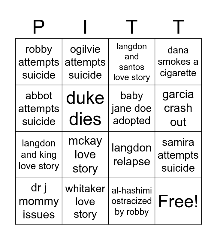 This bingo card has 16 words: whitaker love story, samira attempts suicide, langdon and santos love story, robby attempts suicide, langdon and king love story, ogilvie attempts suicide, langdon relapse, al-hashimi ostracized by robby, abbot attempts suicide, duke dies, dr j mommy issues, dana smokes a cigarette, mckay love story, garcia crash out, baby jane doe adopted and Free!.
