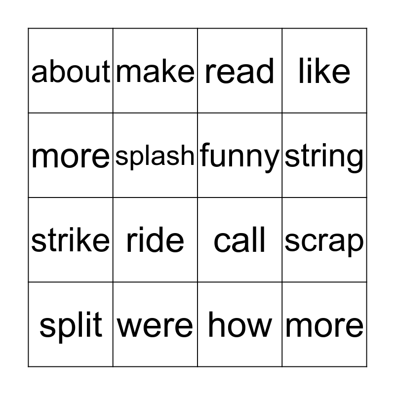 This bingo card has 16 words: were, scrap, read, about, strike, make, call, how, more, splash, split, like, ride, string, funny and more.