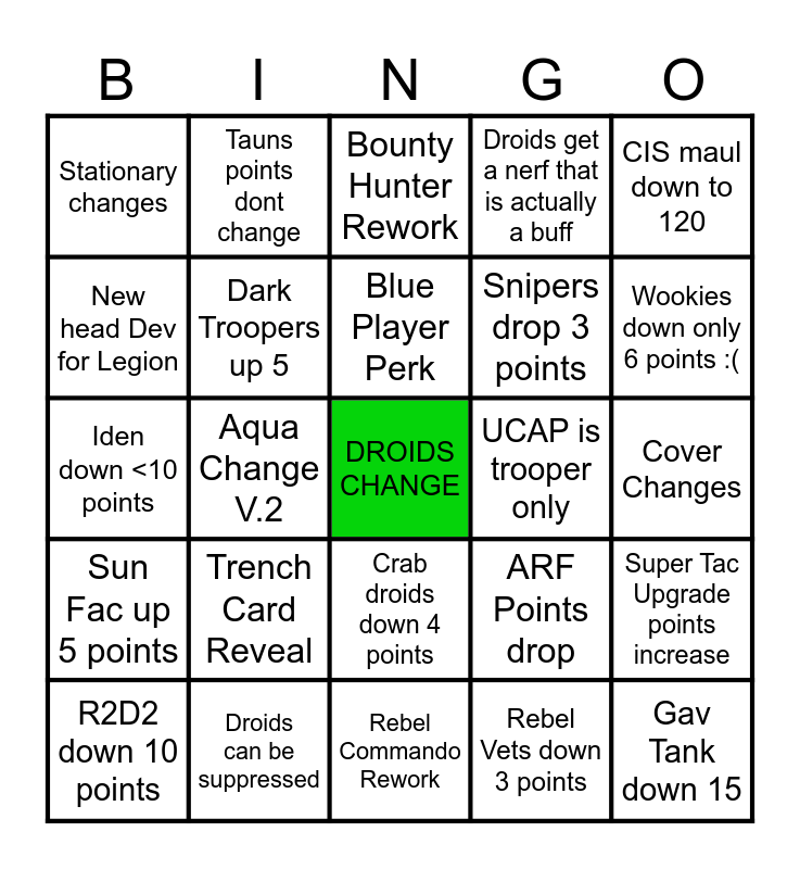 This bingo card has a free space and 24 words: Trench Card Reveal, Droids can be suppressed, Blue Player Perk, R2D2 down 10 points, CIS maul down to 120, Stationary changes, New head Dev for Legion, Tauns points dont change, UCAP is trooper only, Crab droids down 4 points, Snipers drop 3 points, Iden down <10 points, ARF Points drop, Super Tac Upgrade points increase, Dark Troopers up 5, Rebel Vets down 3 points, Cover Changes, Bounty Hunter Rework, Wookies down only 6 points :(, Aqua Change V.2, Gav Tank down 15, Sun Fac up 5 points, Droids get a nerf that is actually a buff and Rebel Commando Rework.