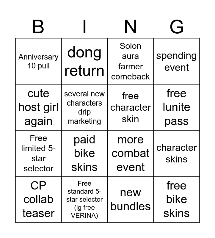 This bingo card has 20 words: character skins, more optimization, Solon aura farmer comeback, 7+ events (because THALA for a reason), CP collab teaser, cute host girl again, Free standard 5-star selector (ig free VERINA), Anniversary 10 pull, Free limited 5-star selector, dong return, paid bike skins, more combat event, several new characters drip marketing, free bike skins, free character skin, more chisa, free lunite pass, spending event, new bundles and Substat changers.