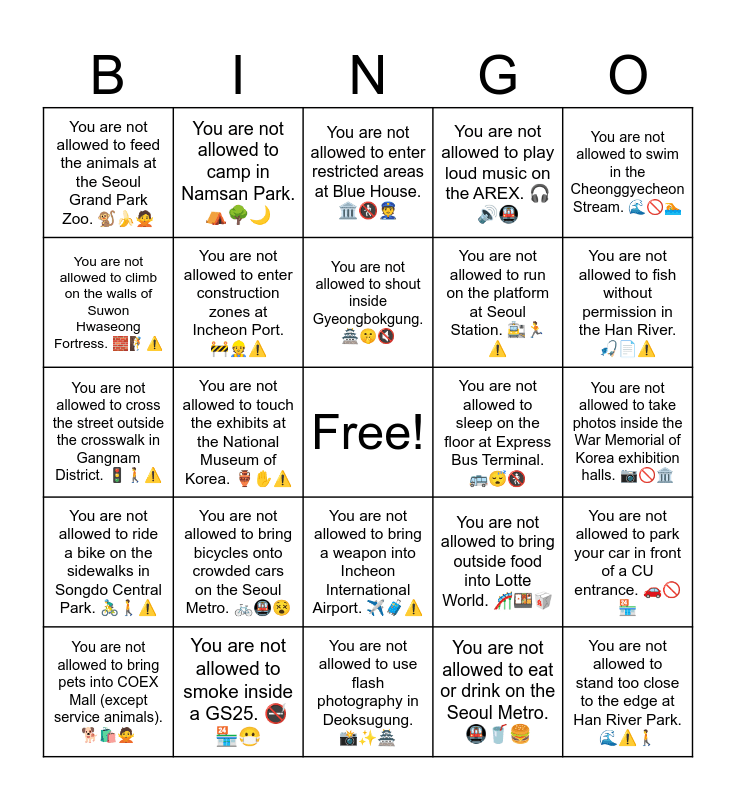 This bingo card has a free space and 26 words: You are not allowed to bring a weapon into Incheon International Airport. โ๏ธ๐งณโ ๏ธ, You are not allowed to eat or drink on the Seoul Metro. ๐๐ฅค๐, You are not allowed to shout inside Gyeongbokgung. ๐ฏ๐คซ๐, You are not allowed to smoke inside a GS25. ๐ญ๐ช๐ท, You are not allowed to swim in the Cheonggyecheon Stream. ๐๐ซ๐, You are not allowed to feed the animals at the Seoul Grand Park Zoo. ๐๐๐ , You are not allowed to climb on the walls of Suwon Hwaseong Fortress. ๐งฑ๐งโ ๏ธ, You are not allowed to camp in Namsan Park. โบ๐ณ๐, You are not allowed to take photos inside the War Memorial of Korea exhibition halls. ๐ท๐ซ๐๏ธ, You are not allowed to bring outside food into Lotte World. ๐ข๐ฑ๐ฅก, You are not allowed to run on the platform at Seoul Station. ๐๐โ ๏ธ, You are not allowed to cross the street outside the crosswalk in Gangnam District. ๐ฆ๐ถโ ๏ธ, You are not allowed to park your car in front of a CU entrance. ๐๐ซ๐ช, You are not allowed to bring pets into COEX Mall (except service animals). ๐๐๏ธ๐ , You are not allowed to touch the exhibits at the National Museum of Korea. ๐บโโ ๏ธ, You are not allowed to drink alcohol in public at Incheon Chinatown late at night. ๐บ๐๐ซ, You are not allowed to play loud music on the AREX. ๐ง๐๐, You are not allowed to ride a bike on the sidewalks in Songdo Central Park. ๐ดโโ๏ธ๐ถโ ๏ธ, You are not allowed to enter restricted areas at Blue House. ๐๏ธ๐ท๐ฎ, You are not allowed to stand too close to the edge at Han River Park. ๐โ ๏ธ๐ถ, You are not allowed to fish without permission in the Han River. ๐ฃ๐โ ๏ธ, You are not allowed to use flash photography in Deoksugung. ๐ธโจ๐ฏ, You are not allowed to sleep on the floor at Express Bus Terminal. ๐๐ด๐ท, You are not allowed to bring bicycles onto crowded cars on the Seoul Metro. ๐ฒ๐๐ต, You are not allowed to enter construction zones at Incheon Port. ๐ง๐ทโ ๏ธ and You are not allowed to feed pigeons at Seoul Plaza. ๐ฆ๐๐ .