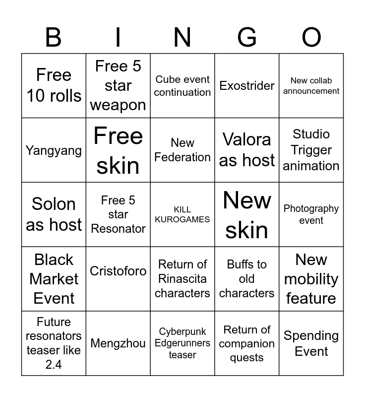 This bingo card has a free space and 24 words: Cristoforo, Mengzhou, New Federation, Future resonators teaser like 2.4, New collab announcement, Free 10 rolls, Yangyang, Free 5 star weapon, New skin, Return of Rinascita characters, Valora as host, Solon as host, Buffs to old characters, New mobility feature, Free skin, Return of companion quests, Photography event, Cube event continuation, Studio Trigger animation, Free 5 star Resonator, Spending Event, Black Market Event, Exostrider and Cyberpunk Edgerunners teaser.