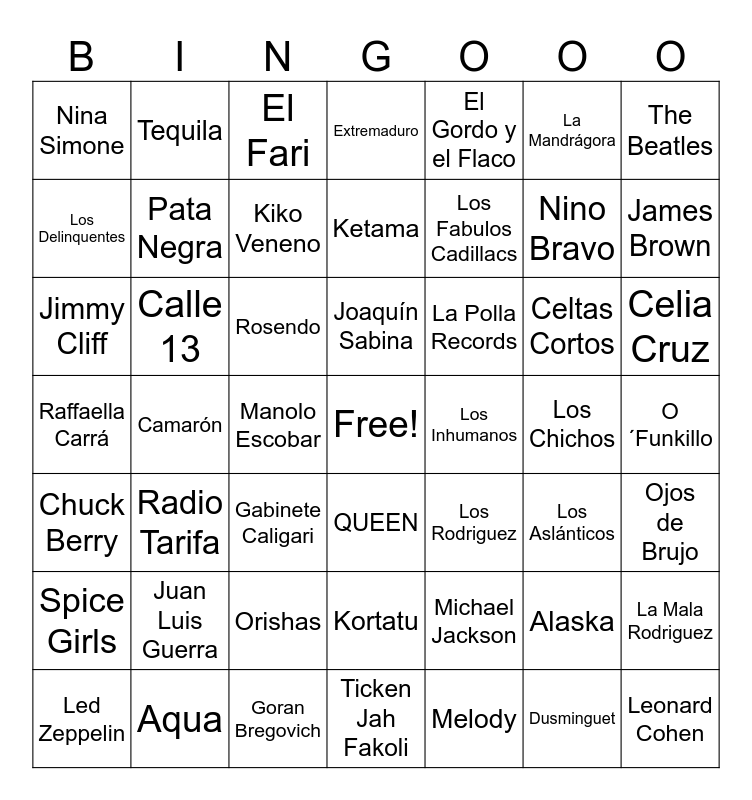 This bingo card has a free space and 48 words: Michael Jackson, Nino Bravo, Ticken Jah Fakoli, Camarón, Rosendo, O´Funkillo, Tequila, Aqua, La Mandrágora, QUEEN, The Beatles, Extremaduro, Celtas Cortos, La Polla Records, Spice Girls, Los Chichos, Los Delinquentes, James Brown, Alaska, El Gordo y el Flaco, Los Fabulos Cadillacs, Manolo Escobar, Nina Simone, Pata Negra, La Mala Rodriguez, Kiko Veneno, Celia Cruz, Led Zeppelin, Joaquín Sabina, Calle 13, Dusminguet, Los Inhumanos, Ojos de Brujo, Juan Luis Guerra, Raffaella Carrá, Los Rodriguez, Los Aslánticos, Jimmy Cliff, Gabinete Caligari, Orishas, Chuck Berry, Leonard Cohen, El Fari, Goran Bregovich, Ketama, Kortatu, Radio Tarifa and Melody.