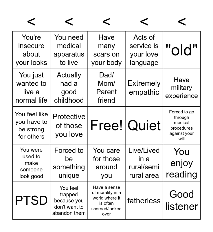 This bingo card has a free space and 24 words: Forced to be something unique, You feel trapped because you don't want to abandon them, Dad/ Mom/ Parent friend, PTSD, "old", You're insecure about your looks, You just wanted to live a normal life, You need medical apparatus to live, Quiet, You care for those around you, Extremely empathic, You feel like you have to be strong for others, Live/Lived in a rural/semi rural area, You enjoy reading, Actually had a good childhood, fatherless, Forced to go through medical procedures against your will, Have many scars on your body, Have military experience, Protective of those you love, Good listener, You were used to make someone look good, Acts of service is your love language and Have a sense of morality in a world where it is often scorned/looked over.
