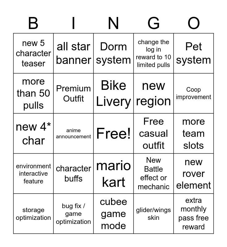 This bingo card has a free space and 33 words: FREE SSR, Bike can fly, anime announcement, cyberpunk collab info, environment interactive feature, Premium Outfit, Pet system, storage optimization, all star banner, farming QoL / skip tickets, Bike Livery, Dorm system, standard banner update, spending event, Free casual outfit, Coop improvement, bug fix / game optimization, new 4* char, character buffs, New Battle effect or mechanic, mario kart, new collab info, new 5 character teaser, more team slots, cubee game mode, extra monthly pass free reward, change the log in reward to 10 limited pulls, new region, more than 50 pulls, new rover element, pin ball minigame, glider/wings skin and echo event.