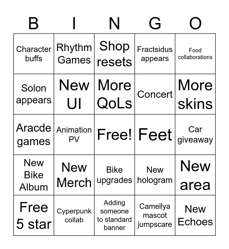 This bingo card has a free space and 24 words: New Merch, Cyperpunk collab, More QoLs, Free 5 star, Food collaborations, Character buffs, Solon appears, Rhythm Games, Feet, Bike upgrades, Concert, Aracde games, New hologram, New area, New UI, Camellya mascot jumpscare, Car giveaway, Shop resets, More skins, Animation PV, New Echoes, New Bike Album, Fractsidus appears and Adding someone to standard banner.