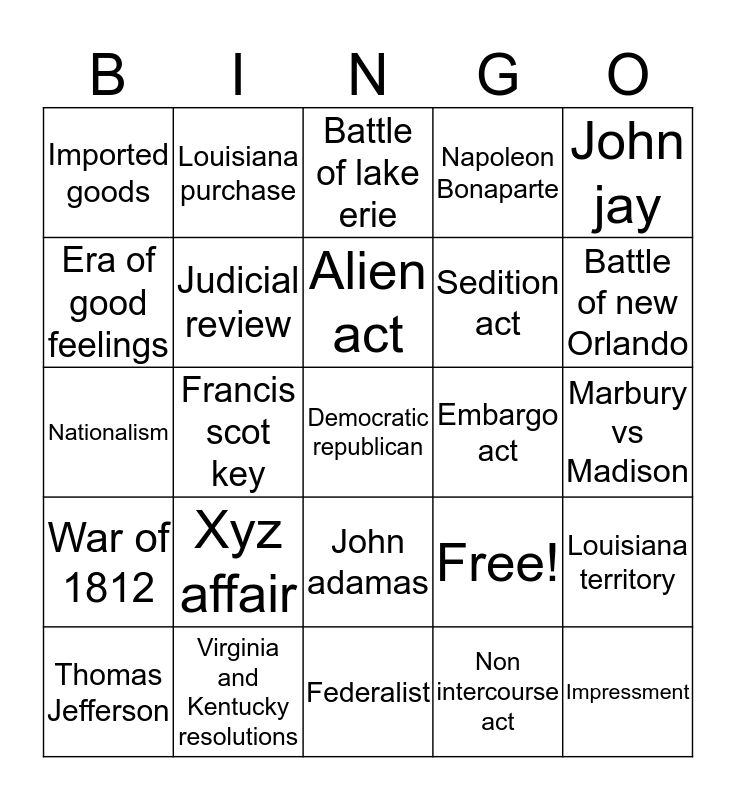 This bingo card has 25 words: Xyz affair, Federalist, Alien act, Thomas Jefferson, John jay, Imported goods, Era of good feelings, Louisiana purchase, Embargo act, John adamas, Sedition act, Nationalism, Free!, Louisiana territory, Judicial review, Impressment, Marbury vs Madison, Battle of lake erie, Battle of new Orlando, Francis scot key, Democratic republican, Virginia and Kentucky resolutions, War of 1812, Napoleon Bonaparte and Non intercourse act.