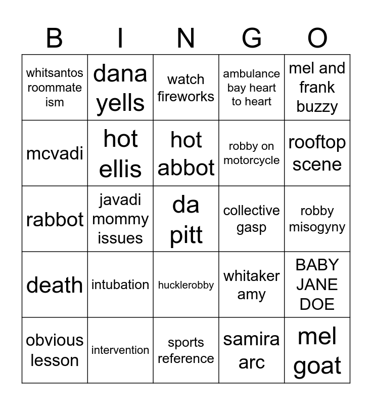 This bingo card has a free space and 24 words: intubation, intervention, hot abbot, obvious lesson, mel and frank buzzy, whitsantos roommate ism, mcvadi, dana yells, collective gasp, hucklerobby, robby on motorcycle, rabbot, whitaker amy, BABY JANE DOE, hot ellis, samira arc, robby misogyny, watch fireworks, rooftop scene, javadi mommy issues, mel goat, death, ambulance bay heart to heart and sports reference.