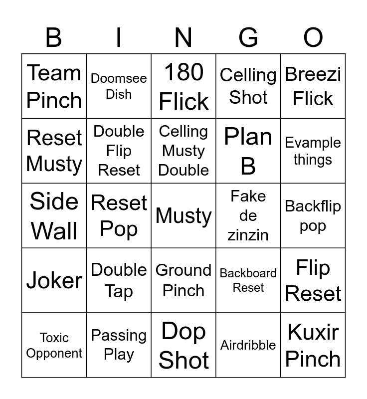 This bingo card has a free space and 24 words: Double Tap, Passing Play, Celling Musty Double, Toxic Opponent, Breezi Flick, Team Pinch, Reset Musty, Doomsee Dish, Fake de zinzin, Ground Pinch, Plan B, Side Wall, Backboard Reset, Flip Reset, Double Flip Reset, Airdribble, Backflip pop, 180 Flick, Evample things, Reset Pop, Kuxir Pinch, Joker, Celling Shot and Dop Shot.
