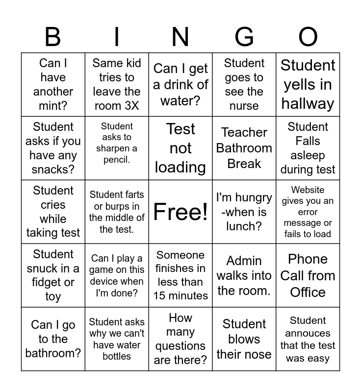 This bingo card has a free space and 29 words: Can I go to the bathroom?, Sits on floor, Student farts or burps in the middle of the test., Student takes off shoes while testing, Can I have another mint?, Can I get a drink of water?, Student asks to sharpen a pencil., Can I play a game on this device when I'm done?, I'm hungry -when is lunch?, Student asks why we can't have water bottles, Website gives you an error message or fails to load, Student annouces that the test was easy, How many questions are there?, Student blows their nose, Student Falls asleep during test, Is this the only flavor of mints?, Someone finishes in less than 15 minutes, Student snuck in a fidget or toy, Student yells in hallway, Student cries while taking test, Admin walks into the room., Student forgot a silent reading book., Teacher Bathroom Break, Student asks if you have any snacks?, Student goes to see the nurse, Same kid tries to leave the room 3X, Phone Call from Office, Test not loading and Someone at your classroom door.