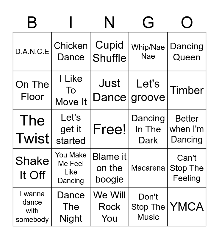 This bingo card has a free space and 24 words: You Make Me Feel Like Dancing, Dance The Night, Just Dance, I wanna dance with somebody, Dancing Queen, D.A.N.C.E, On The Floor, Chicken Dance, Dancing In The Dark, Blame it on the boogie, Let's groove, The Twist, Macarena, Can't Stop The Feeling, I Like To Move It, Don't Stop The Music, Better when I'm Dancing, Cupid Shuffle, Timber, Let's get it started, YMCA, Shake It Off, Whip/Nae Nae and We Will Rock You.