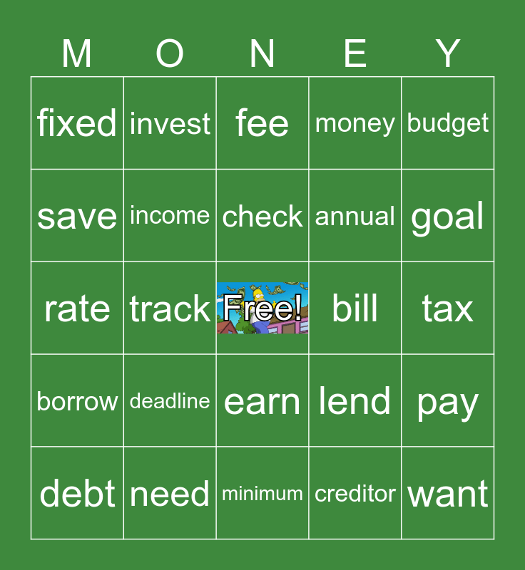 This bingo card has a free space and 29 words: debt, expense, track, approve, fixed, fee, income, deadline, bill, need, tax, want, minimum, creditor, goal, interest, earn, borrow, budget, rate, lend, plan, annual, save, money, invest, pay, check and variable.