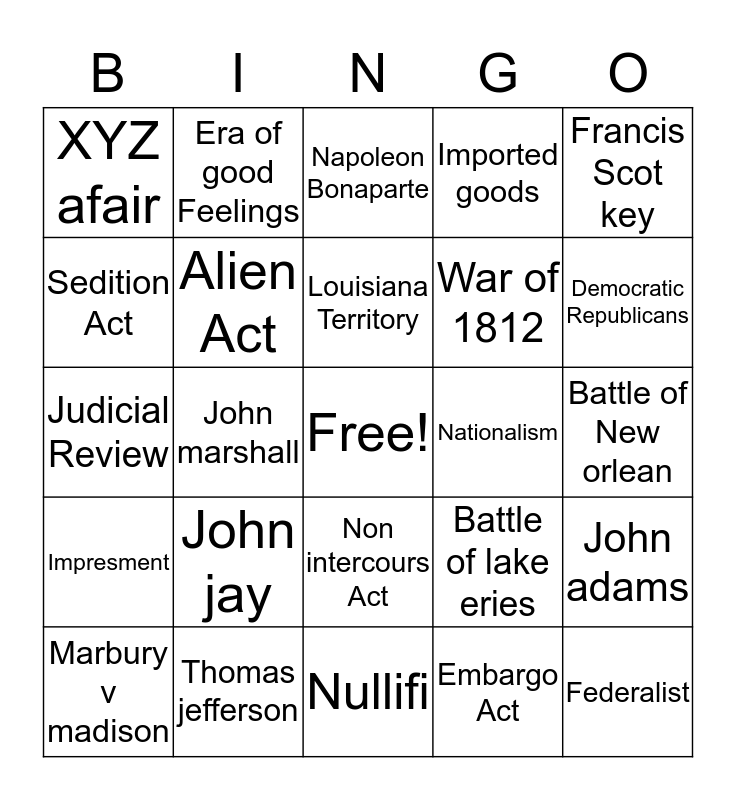 This bingo card has a free space and 24 words: John jay, Thomas jefferson, Louisiana Territory, Marbury v madison, Francis Scot key, XYZ afair, Sedition Act, Era of good Feelings, Nationalism, Non intercours Act, War of 1812, Judicial Review, Battle of lake eries, John adams, Alien Act, Embargo Act, Battle of New orlean, Napoleon Bonaparte, Democratic Republicans, John marshall, Federalist, Impresment, Imported goods and Nullifi.