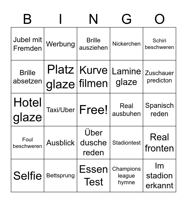 This bingo card has a free space and 24 words: Ausblick, Bettsprung, Kurve filmen, Selfie, Schiri beschweren, Jubel mit Fremden, Brille absetzen, Werbung, Real ausbuhen, Über dusche reden, Lamine glaze, Hotel glaze, Stadiontest, Real fronten, Platz glaze, Champions league hymne, Spanisch reden, Brille ausziehen, Zuschauer predicton, Taxi/Uber, Im stadion erkannt, Foul beschweren, Nickerchen and Essen Test.