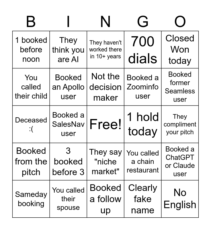 This bingo card has a free space and 24 words: 3 booked before 3, You called their spouse, Not the decision maker, Sameday booking, Closed Won today, 1 booked before noon, You called their child, They think you are AI, 1 hold today, They say "niche market", Booked a Zoominfo user, Deceased :(, You called a chain restaurant, Booked a ChatGPT or Claude user, Booked an Apollo user, Clearly fake name, They compliment your pitch, They haven't worked there in 10+ years, Booked former Seamless user, Booked a SalesNav user, No English, Booked from the pitch, 700 dials and Booked a follow up.