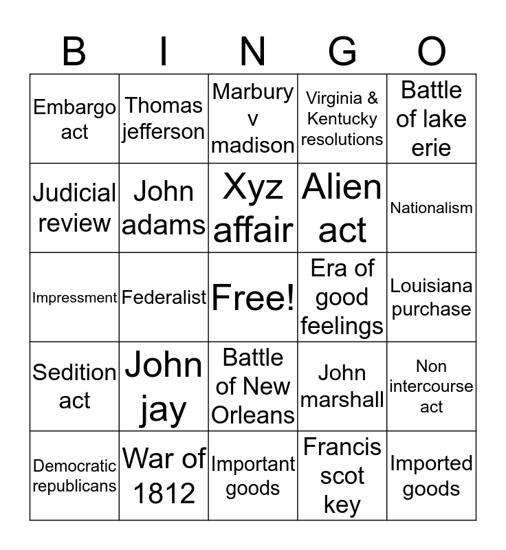 This bingo card has a free space and 24 words: John jay, War of 1812, Xyz affair, Democratic republicans, Battle of lake erie, Embargo act, Judicial review, Thomas jefferson, Era of good feelings, Battle of New Orleans, Alien act, Impressment, John marshall, Non intercourse act, John adams, Francis scot key, Louisiana purchase, Marbury v madison, Nationalism, Federalist, Imported goods, Sedition act, Virginia & Kentucky resolutions and Important goods.