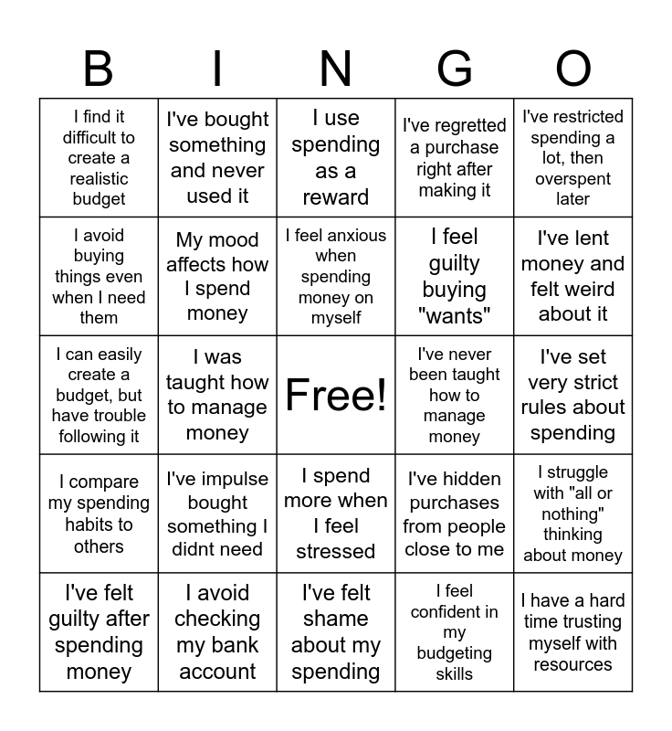 This bingo card has a free space and 24 words: I've impulse bought something I didnt need, I avoid checking my bank account, I feel anxious when spending money on myself, I've felt guilty after spending money, I've restricted spending a lot, then overspent later, I find it difficult to create a realistic budget, I avoid buying things even when I need them, I've bought something and never used it, I've never been taught how to manage money, I spend more when I feel stressed, I feel guilty buying "wants", I can easily create a budget, but have trouble following it, I've hidden purchases from people close to me, I struggle with "all or nothing" thinking about money, My mood affects how I spend money, I feel confident in my budgeting skills, I've set very strict rules about spending, I use spending as a reward, I've lent money and felt weird about it, I was taught how to manage money, I have a hard time trusting myself with resources, I compare my spending habits to others, I've regretted a purchase right after making it and I've felt shame about my spending.