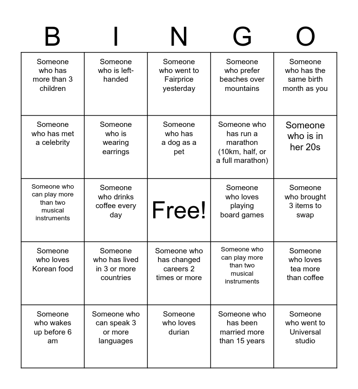 This bingo card has a free space and 24 words: Someone who has lived in 3 or more countries, Someone who can speak 3 or more languages, Someone who has a dog as a pet, Someone who wakes up before 6 am, Someone who has the same birth month as you, Someone who has more than 3 children, Someone who has met a celebrity, Someone who is left-handed, Someone who loves playing board games, Someone who has changed careers 2 times or more, Someone who has run a marathon (10km, half, or a full marathon), Someone who can play more than two musical instruments, Someone who can play more than two musical instruments, Someone who loves tea more than coffee, Someone who is wearing earrings, Someone who has been married more than 15 years, Someone who brought 3 items to swap, Someone who went to Fairprice yesterday, Someone who is in her 20s, Someone who drinks coffee every day, Someone who went to Universal studio, Someone who loves Korean food, Someone who prefer beaches over mountains and Someone who loves durian.