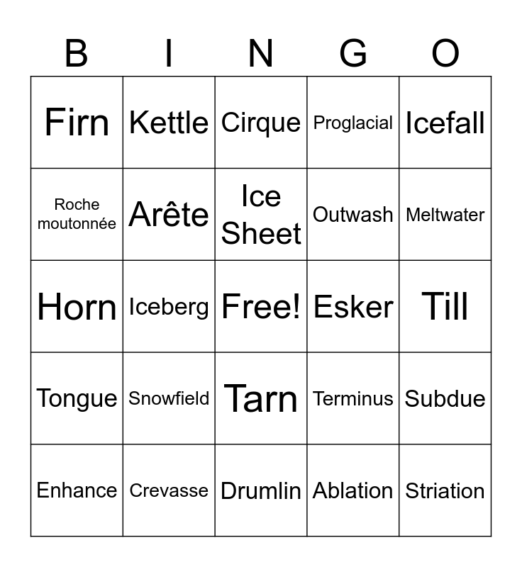 This bingo card has a free space and 30 words: Crevasse, Moraine, Iceberg, Calving, Firn, Cirque, Arête, Tarn, Esker, Drumlin, Till, Striation, Ablation, Accumulation, Meltwater, Crystalline, Terminus, Tongue, Snowfield, Icefall, Horn, Fjord, Kettle, Outwash, Roche moutonnée, Proglacial, Subdue, Enhance, Ice Sheet and Piedmont.