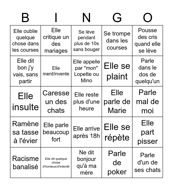 This bingo card has a free space and 24 words: Elle parle beaucoup fort, Elle dit quelque chose d'honteux/d'interdit, Elle appelle par "mon" Lopette ou Mino, Racisme banalisé, Pousse des cris quand elle se lève, Elle oublie quelque chose dans les courses, Elle dit bon j'y vais, sans partir, Elle critique un des mariages, Elle parle de Marie, Elle arrive après 18h, Elle se plaint, Elle insulte, Elle se répète, Elle part pisser, Elle ment/invente, Parle de poker, Parle mal de moi, Se lève pendant plus de 10s sans bouger, Parle dans le dos de quelqu'un, Caresse un des chats, Parle d'un de ses chats, Ramène sa tasse à l'évier, Se trompe dans les courses and Ne dit bonjour qu'à ma mère.