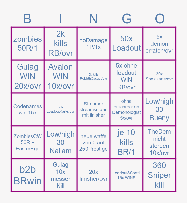 This bingo card has a free space and 24 words: b2b BRwin, Low/high 30 Nallam, 5k kills RebirthCasual/ovr, Loadout&Spezi 15x WINS, 5x demon erraten/ovr, zombies 50R/1, 2k kills RB/ovr, noDamage 1P/1x, ohne erschrecken Demonologist 5x/ovr, Low/high 30 Bueny, Codenames win 15x, Avalon WIN 10x/ovr, je 10 kills BR/1, TheDem nicht sterben 10x/ovr, Gulag WIN 20x/ovr, Gulag 10x messer Kill, 20x finisher/ovr, 50x Loadout, 30x Spezikarte/ovr, ZombiesCW 50R + EasterEgg, 50x LoadoutKarte/ovr, neue waffe von 0 auf 250Prestige, 5x ohne loadout WIN RB/ovr and 360 Sniper kill.
