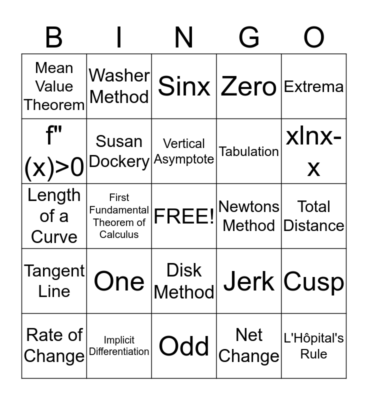 This bingo card has a free space and 24 words: One, Implicit Differentiation, Vertical Asymptote, Rate of Change, Extrema, Mean Value Theorem, f"(x)>0, Washer Method, Newtons Method, Disk Method, Tabulation, Length of a Curve, Jerk, Cusp, Susan Dockery, Net Change, Total Distance, Sinx, xlnx-x, First Fundamental Theorem of Calculus, L'Hôpital's Rule, Tangent Line, Zero and Odd.
