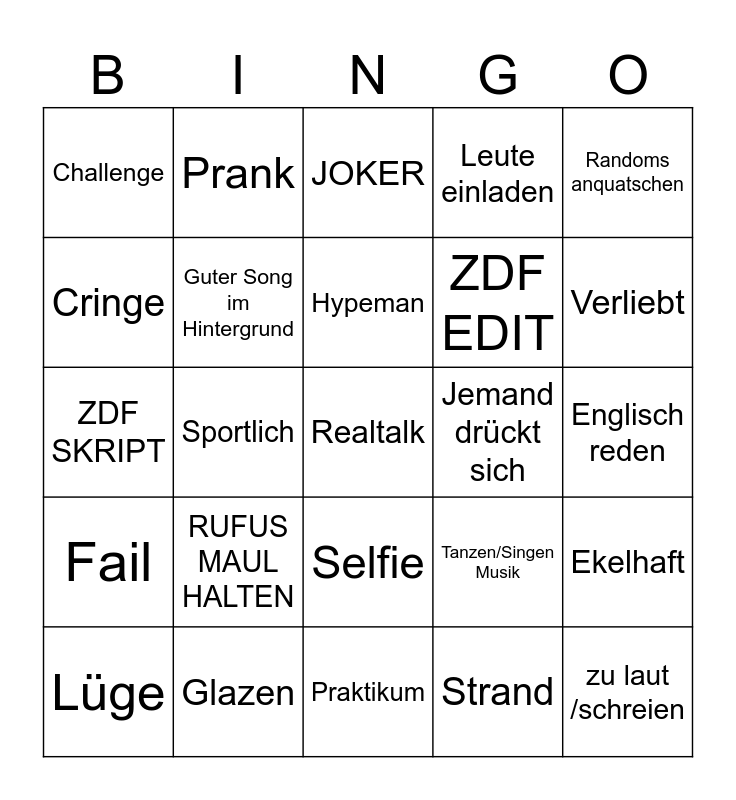 This bingo card has a free space and 24 words: RUFUS MAUL HALTEN, Glazen, Hypeman, Lüge, Randoms anquatschen, Challenge, Cringe, Prank, Jemand drückt sich, Selfie, ZDF EDIT, ZDF SKRIPT, Tanzen/Singen Musik, Ekelhaft, Guter Song im Hintergrund, Strand, Englisch reden, JOKER, Verliebt, Sportlich, zu laut /schreien, Fail, Leute einladen and Praktikum.