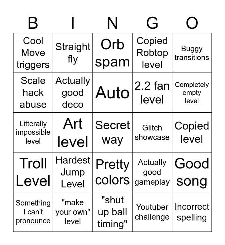 This bingo card has a free space and 24 words: Hardest Jump Level, "make your own" level, Auto, Something I can't pronounce, Buggy transitions, Cool Move triggers, Scale hack abuse, Straight fly, Glitch showcase, Pretty colors, 2.2 fan level, Litterally impossible level, Actually good gameplay, Good song, Actually good deco, Youtuber challenge, Copied level, Orb spam, Completely empty level, Art level, Incorrect spelling, Troll Level, Copied Robtop level and "shut up ball timing".