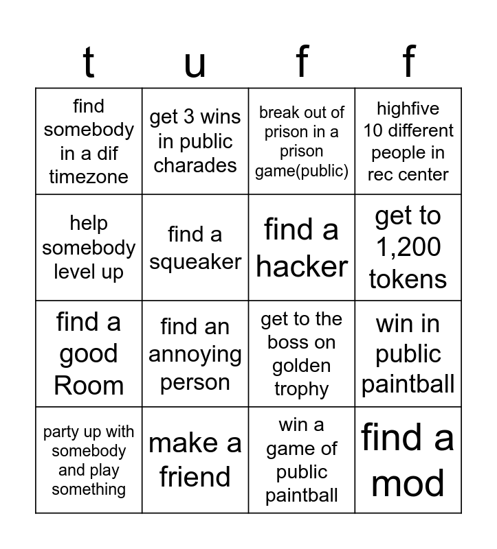This bingo card has 16 words: make a friend, win in public paintball, break out of prison in a prison game(public), find somebody in a dif timezone, find a good Room, get 3 wins in public charades, get to the boss on golden trophy, win a game of public paintball, help somebody level up, find a squeaker, party up with somebody and play something, highfive 10 different people in rec center, find an annoying person, get to 1,200 tokens, find a hacker and find a mod.