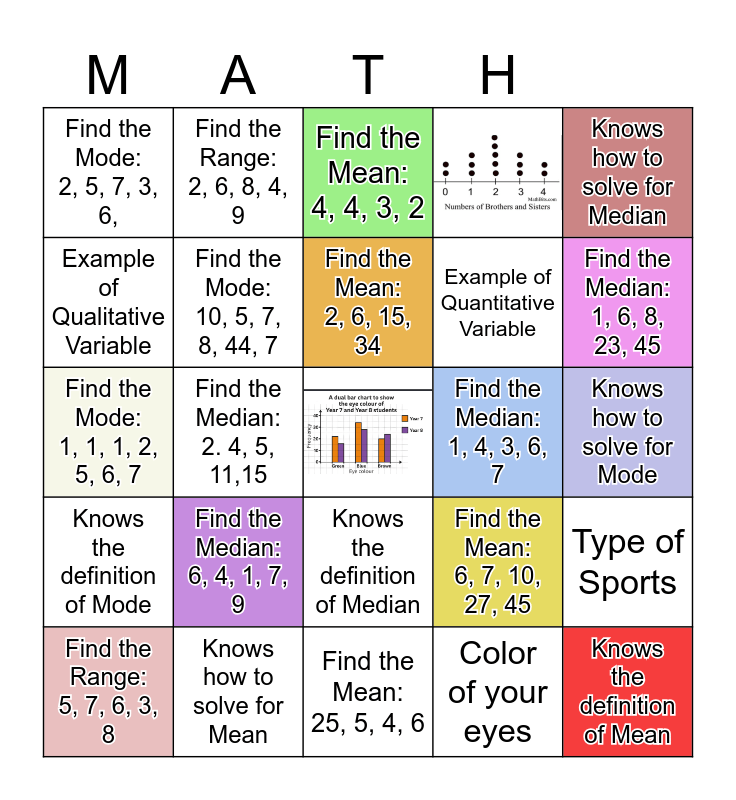 This bingo card has 2 images and 31 words: Knows the definition of Mean, Find the Mode: 11, 47, 56, 12, 12, Find the Median: 2. 4, 5, 11,15, Find the Mean: 5, 2, 6, Knows the definition of Mode, Find the Mode: 10, 5, 7, 8, 44, 7, Knows how to solve for Median, Find the Range: 5, 7, 6, 3, 8, Find the Range: 2, 6, 8, 4, 9, Find the Mode: 2, 3,5,5 7,10, Find the Mean: 2, 6, 15, 34, Find the Mean: 4, 4, 3, 2, MATH, Knows the definition of Mode, Find the Median: 1, 4, 3, 6, 7, Find the Median: 1, 6, 8, 23, 45, Knows how to solve for Mean, Find the Mode: 1, 1, 1, 2, 5, 6, 7, Find the Median: 6, 4, 1, 7, 9, Find the Mean: 6, 7, 10, 27, 45, Knows the definition of Median, Find the Mean: 8, 15, 6, 3, Find the Mode: 2, 5, 7, 3, 6,, Knows how to solve for Mode, Find the Mean: 25, 5, 4, 6, Example of Quantitative Variable, Example of Qualitative Variable, Type of Sports, Number of pets, Color of your eyes and Type of car.