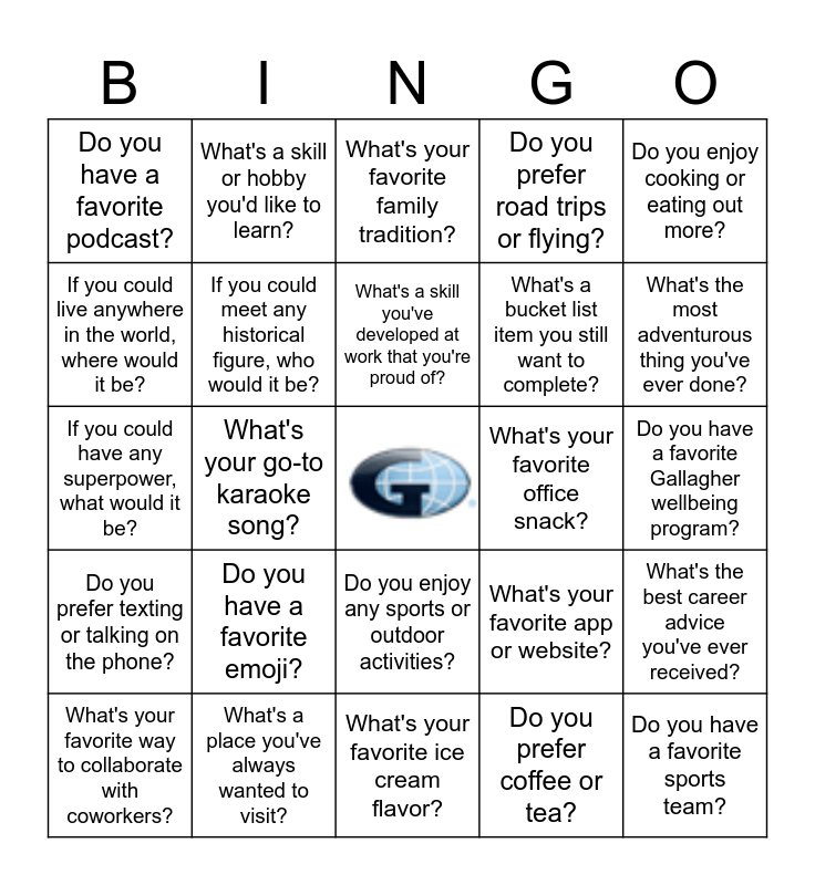 This bingo card has a free space and 99 words: Where did you grow up?, What's your favorite childhood memory?, Do you have any siblings? If so, how many?, What's your favorite family tradition?, Did you have a childhood nickname?, What's a fun fact about your hometown?, What's your favorite holiday or celebration?, Do you have any pets? If not, would you like one?, What's your favorite type of cuisine?, What's a dish you love to cook or eat?, What's your favorite hobby?, Do you play any musical instruments?, What's your favorite book or genre to read?, Do you enjoy any sports or outdoor activities?, What's your favorite TV show or movie?, Do you have a favorite podcast?, What's a skill or hobby you'd like to learn?, Are you more of a morning person or a night owl?, Do you enjoy traveling? If so, what's your favorite destination?, What's your dream vacation spot?, How long have you been working at Gallagher?, What's your favorite part of your job?, What's a project you're particularly proud of?, What inspired you to pursue your career?, Have you worked in other industries before?, What's the best career advice you've ever received?, What's a skill you've developed at work that you're proud of?, Do you prefer working in a team or independently?, What's your favorite Gallagher value or principle?, What's a professional goal you're currently working on?, What's your favorite ice cream flavor?, Do you prefer coffee or tea?, What's your favorite way to spend a weekend?, Do you have a favorite board game or card game?, What's your go-to karaoke song?, If you could have any superpower, what would it be?, What's your favorite type of dessert?, Do you prefer the beach or the mountains?, What's your favorite season of the year?, Do you have a favorite emoji?, Have you ever traveled internationally? If so, where?, What's the most adventurous thing you've ever done?, Do you prefer road trips or flying?, What's a place you've always wanted to visit?, Have you ever tried a unique or unusual food?, What's your favorite travel memory?, Do you enjoy camping or glamping?, What's the longest trip you've ever taken?, Have you ever been on a cruise?, What's your favorite city you've visited?, What's your favorite type of music or artist?, Do you have a favorite sports team?, What's your favorite app or website?, Do you have a favorite quote or saying?, What's your favorite type of exercise or workout?, Do you have a favorite restaurant or café?, What's your favorite childhood cartoon or show?, Do you have a favorite holiday tradition?, What's your favorite way to relax after work?, Do you have a favorite charity or cause?, Do you prefer working from home or in the office?, Are you more of a planner or a go-with-the-flow person?, Do you prefer books or movies?, Are you a dog person or a cat person?, Do you prefer sweet or savory snacks?, Do you enjoy cooking or eating out more?, Are you more of an introvert or extrovert?, Do you prefer hot weather or cold weather?, Do you enjoy surprises or prefer to plan everything?, Do you prefer texting or talking on the phone?, What's a bucket list item you've completed?, What's a bucket list item you still want to complete?, If you could live anywhere in the world, where would it be?, What's your dream job?, If you won the lottery, what's the first thing you'd do?, What's a personal goal you're currently working on?, If you could meet any historical figure, who would it be?, What's a skill you've always wanted to master?, If you could start your own business, what would it be?, What's a cause or issue you're passionate about?, What's your favorite office snack?, Do you have a favorite team-building activity?, What's the best work-related advice you've ever received?, What's your favorite way to celebrate wins at work?, Do you have a favorite memory from a Gallagher event?, What's your favorite way to stay organized at work?, Do you have a favorite productivity tip?, What's your favorite way to unwind after a busy workday?, Do you have a favorite Gallagher wellbeing program?, What's your favorite way to collaborate with coworkers?, What's the most unusual job you've ever had?, Do you have a hidden talent?, What's the most interesting thing you've ever learned?, If you could time travel, would you go to the past or the future?, What's the best gift you've ever received?, Do you have a favorite childhood toy or game?, What's the most spontaneous thing you've ever done?, What's the most memorable concert or event you've attended? and If you could swap lives with anyone for a day, who would it be?.